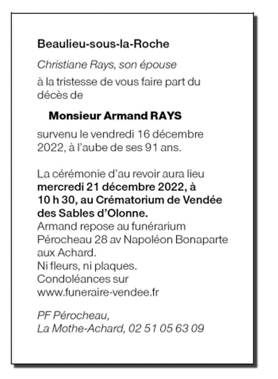 Décédé à Beaulieu-sous-la-Roche (85190, France) le vendredi 16 décembre 2022 à l'âge de 90 ans