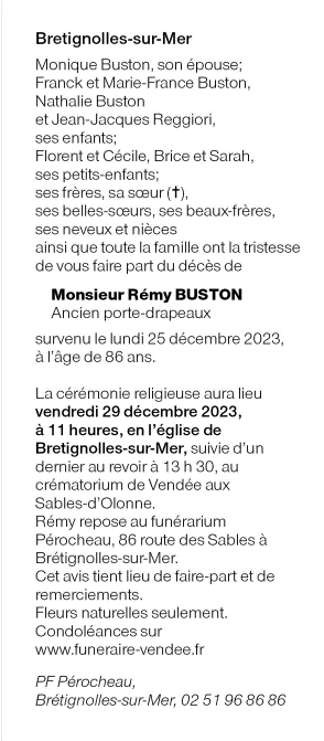 Décédé à Les Sables d'Olonne (85340, France) le lundi 25 décembre 2023 à l'âge de 86 ans
