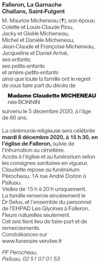 Décédée à Falleron (85670, France) le samedi 5 décembre 2020 à l'âge de 86 ans