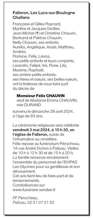 Décédé à Falleron (85670, France) le dimanche 28 avril 2024 à l'âge de 93 ans