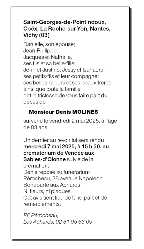 Décédé à Saint-Georges-de-Pointindoux (85150, France) le vendredi 2 mai 2025 à l'âge de 83 ans