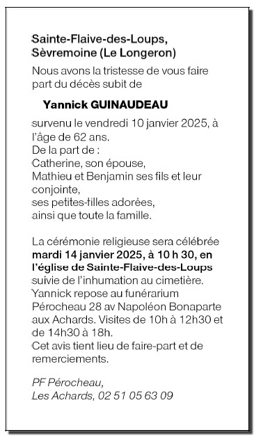 Décédé à Sainte-Flaive-des-Loups (85150, France) le vendredi 10 janvier 2025 à l'âge de 62 ans