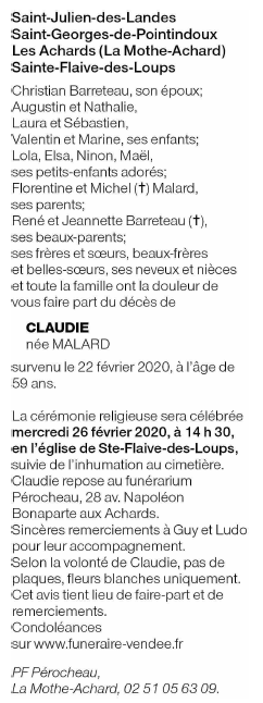 Décédée à La Roche-sur-Yon (85000, France) le samedi 22 février 2020 à l'âge de 59 ans