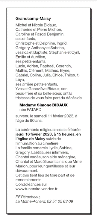 Décédée à La Roche-sur-Yon (85000, France) le samedi 11 février 2023 à l'âge de 90 ans