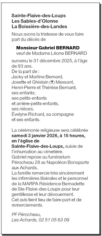 Décédé à Sainte-Flaive-des-Loups (85150, France) le mercredi 31 décembre 2025 à l'âge de 93 ans